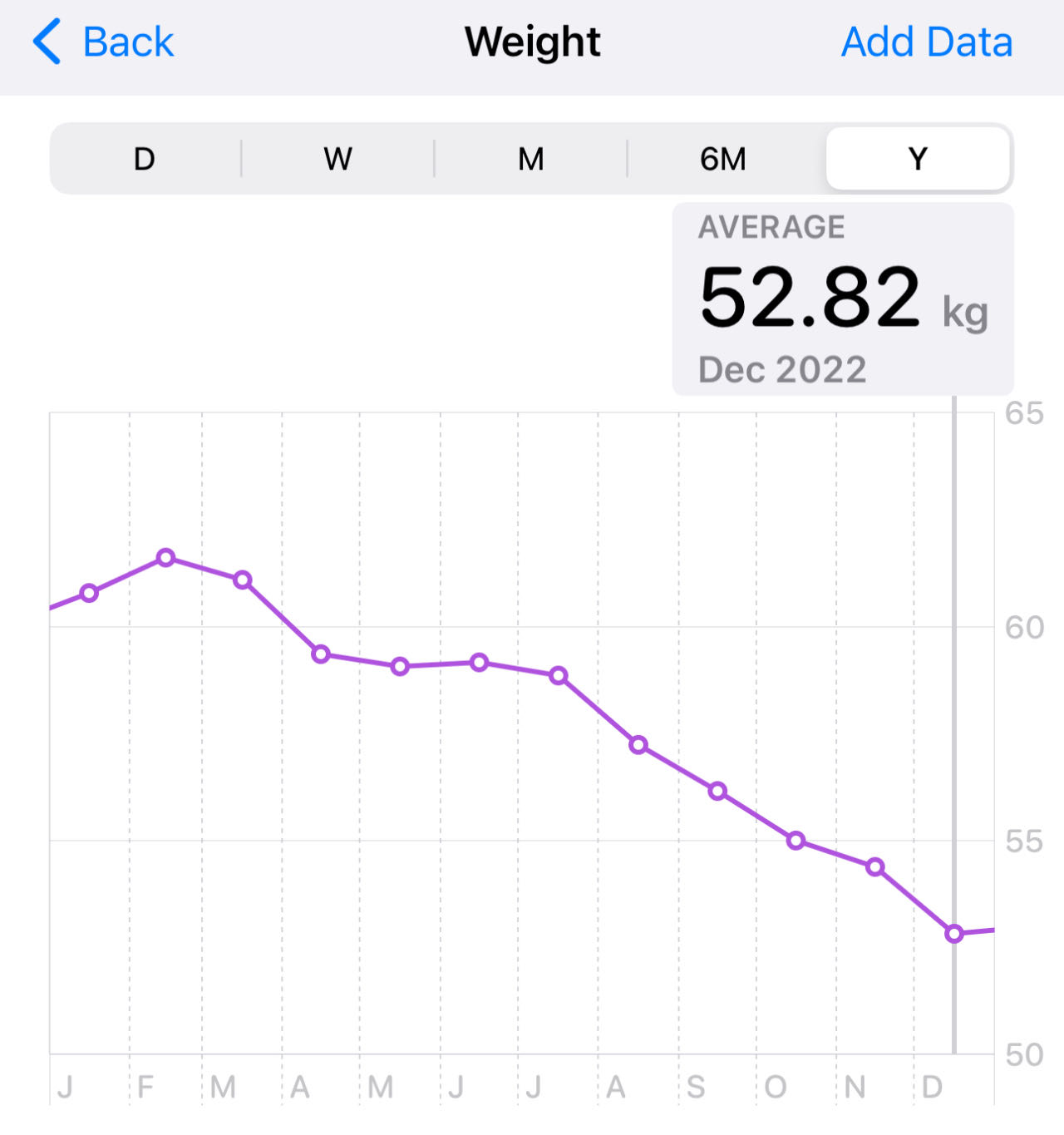 月底公司年度体检开始。因为疫情封控,体重有所下降,体检下来 58 KG,算是近十年最低(年初最重时到了 62 KG)。考虑到工作后体检发现甘油三酯有点高,还有点轻度脂肪肝,终于趁此机会下定决心减重。由于总体佛系,就采取了三个容易坚持下去的措施:一是减少不必要的进食,戒掉零食、奶茶,但三餐没有特别改变;二是多喝水,每天强制自己喝到 2 升水;三是增加运动,上下班从地铁改成轮渡,每周末快走七公里。运动这一项,考虑到跑步坚持不下去,就采取了快走。坚持走了半年,从每公里 10 分多钟到不到 8 分钟。效果还是不错的,年底时体重已经不到 53 KG,肚子没了,感觉也更健康了。