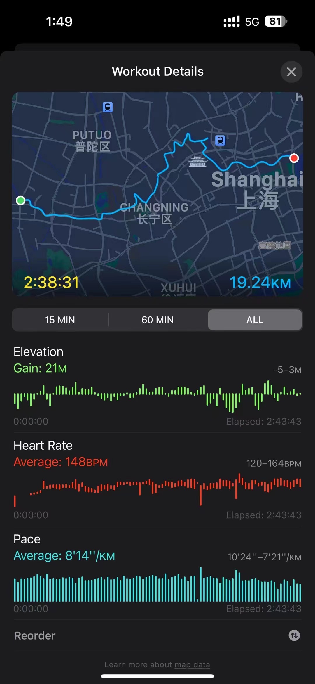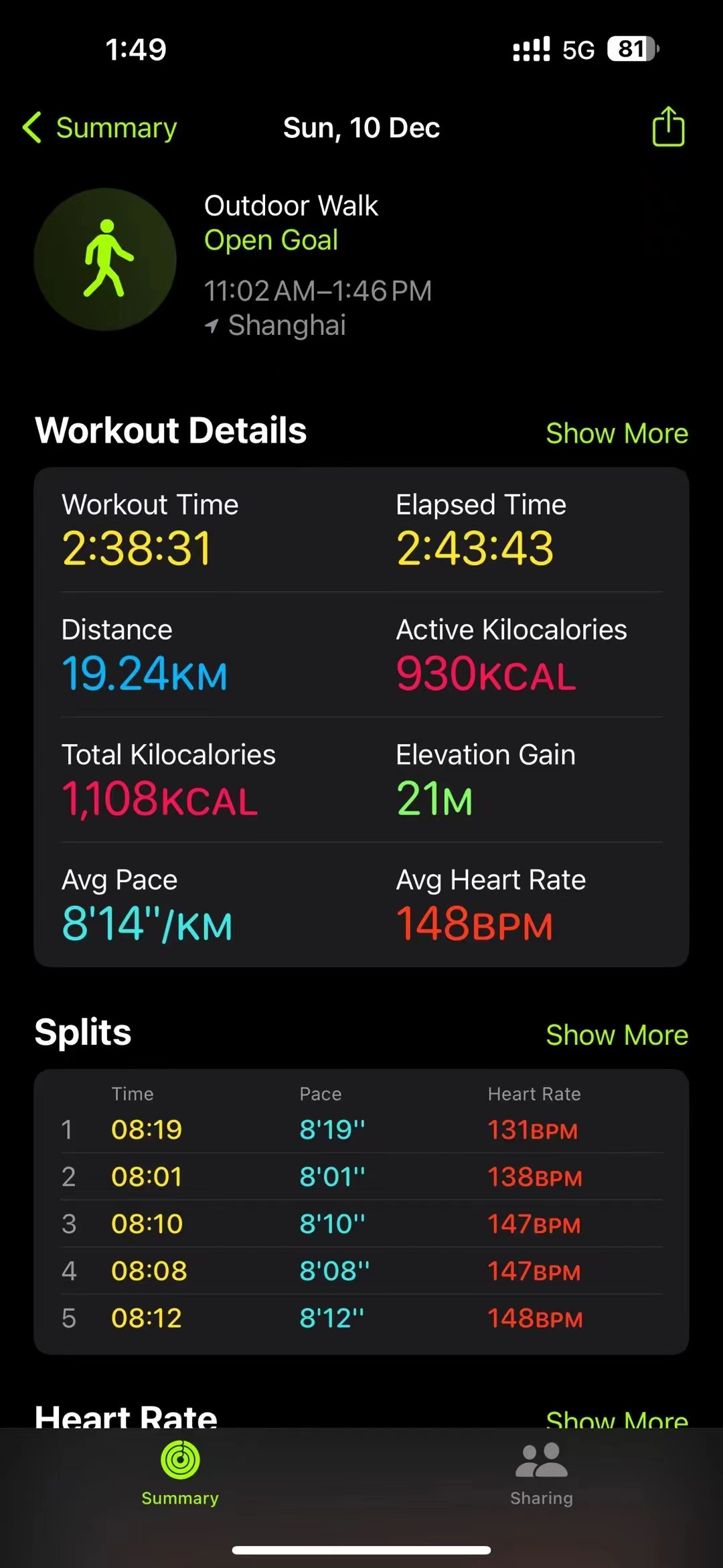12 月初,趁着温度还有 20 度,沿着苏州河从淞虹路/祁连山南路一路走到黄浦江,全程 19 公里,走了 2 小时 40 分钟,平均每公里 8 分 14 秒。走之前以为这么长的路程,平均配速能有个每公里 10 分钟就不错了,没想到还能走进 8 分 30 秒。只是走到最后两三公里,体力已经不支,不然其实想到外滩后再南下走满 20 公里。